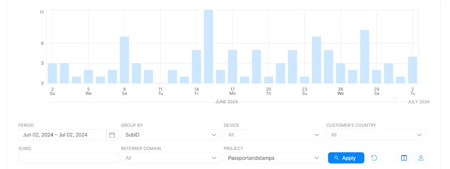 For each brand’s partner program, you can read stats to understand what works, what doesn’t, and what needs a quick fix. Every project is different, and we love analyzing each to maximize profit and serve our audiences better. The visiontrend.org dashboard lets you group by date range, project, devices, and customer country.